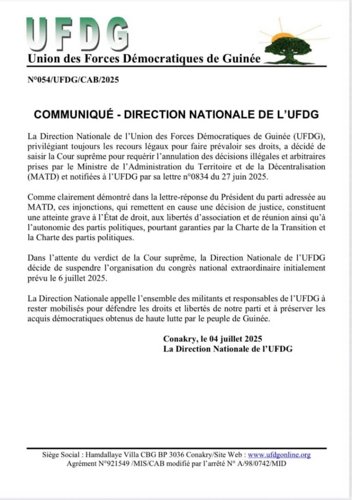 Dans un communiqué rendu public ce vendredi, 04 juillet 2025, le parti dirigé par Cellou Dalein Diallo annonce la saisine de la Cour suprême pour contester des décisions jugées illégales du ministère de l’Administration du Territoire, qui remettent en cause une décision de justice.